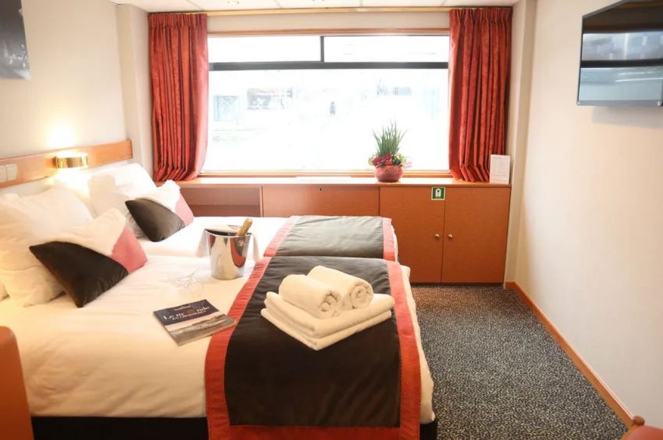 Каютите са общо 67, разпределени на 2 палуби, с площ около 12.50 кв. м. На основната има общо 43 каюти с прозорец. На горната палуба се намират 24 кабини с отварящи се в горната част (плъзгащи) прозорци.