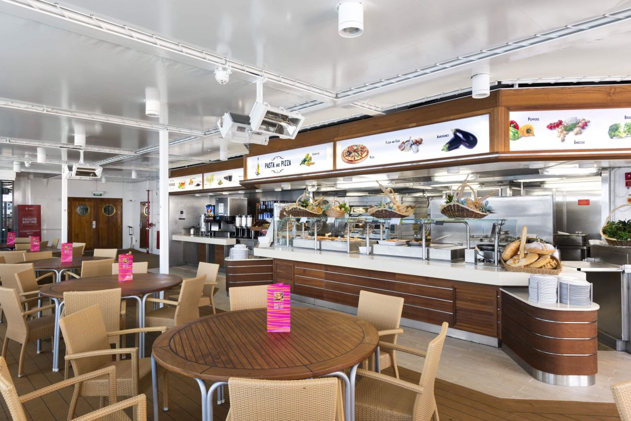Два основни ресторанта L`Approdo и La Caravela и бюфет, включени в цената на круиза, грил, пица и паста бар.