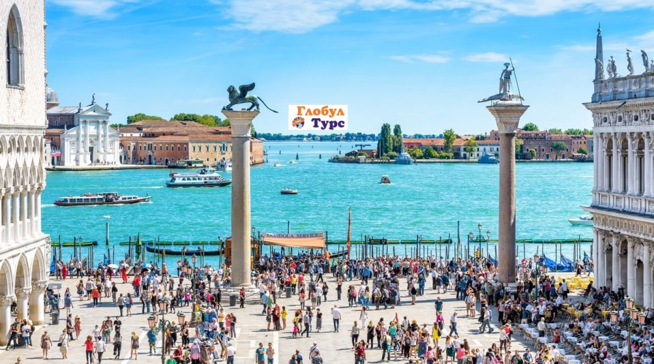 4 ден: Закуска. Отпътуване към пристанището и оттам с кораб към Венеция – „най – романтичния град в света“. Туристическа програма: площад “Сан Марко” – по думите на Наполеон той е „салонът на Европа“, едноименната базилика „Сан Марко“ с пищна позлата, която е символ на венецианското богатство. В базиликата се пазят мощите на покровителя на града Св. Марко. Ще видим Двореца на Дожите /отвън/ - официалната резиденция на някогашния държавен глава на Венецианската република; моста на Въздишките; Камбанарията; Часовниковата кула; разходка по тесните улички с пъстри сувинирни магазинчета до покрития мост Риалто с колоритния пазар и Канале гранде – най – важния и много живописен транспортен коридор на Венеция.