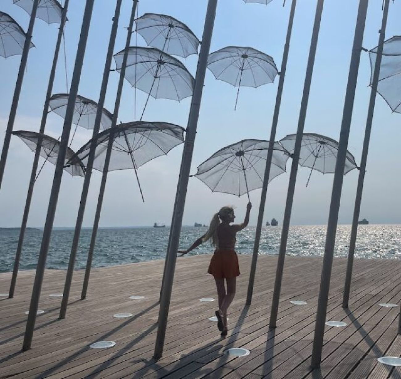Свободно време. Фото пауза при скулптурата "Веселите чадъри". Чадърите в Солун са ефирна конструкция с мрежеста структура, която позволява в тях да се вплитат както слънчевите лъчи, така и блясъкът на вълните.
