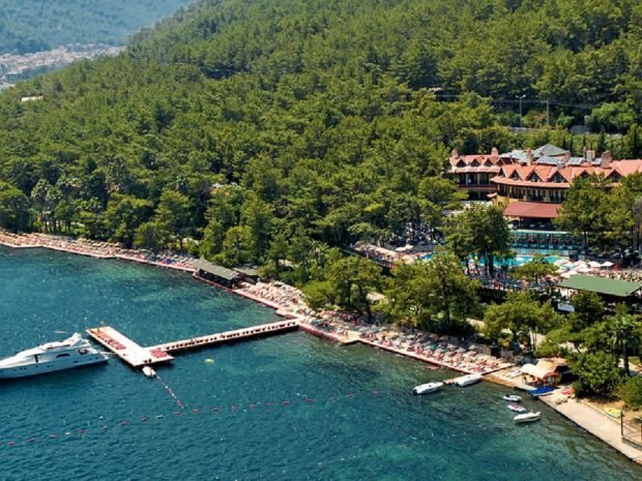 На 98 км. от летището в гр. Даламан, 6 км от центъра на Мармарис, 2 kм. от Ичмелер, на брега на морето със собствен плаж – изкуствена платформа опесъчена. последно реновиран през 2011 г.