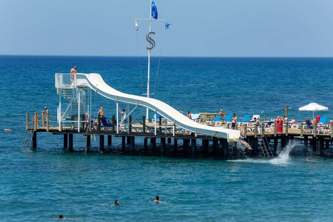 Собствен, пясък, чакъл. Пирс. На басейна и на плажа: чадъри, шезлонги, матраци - безплатно. Плажни кърпи - депозит (замяна - 3 пъти седмично, безплатно)