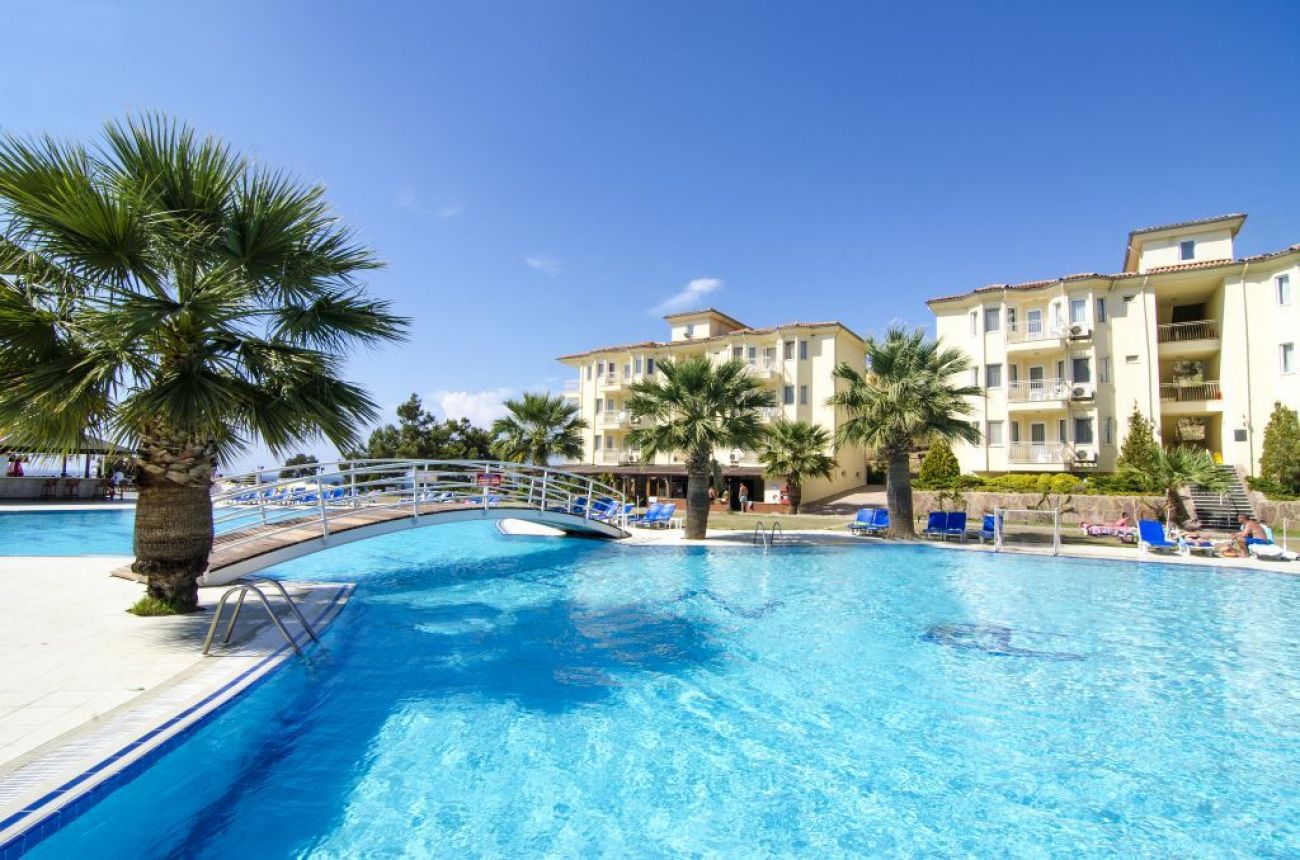 Хотелът разполага с открит плувен басейн за възрастни и по-малък басейн за децата, зона за отдих с шезлонги и голяма градина която води директно към плажната ивица.